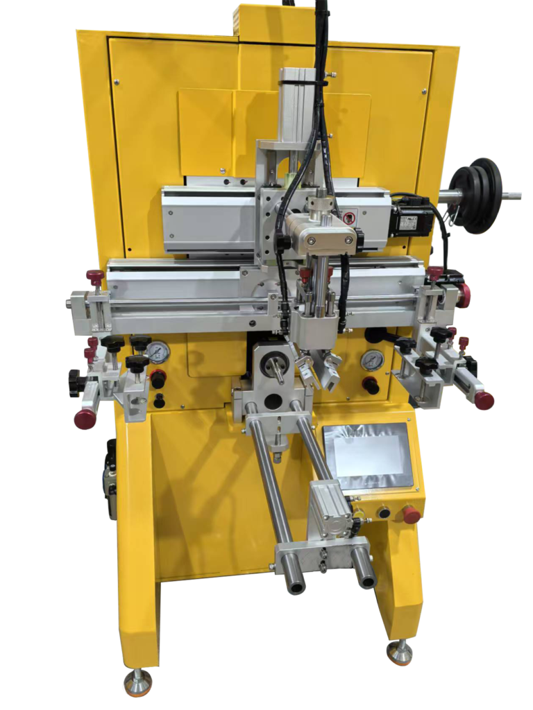 The semi-automatic servo screen printer typically operates with manual loading and unloading. The operator places the bottle into a fixture for positioning, and the machine runs the preset printing cycle automatically.
